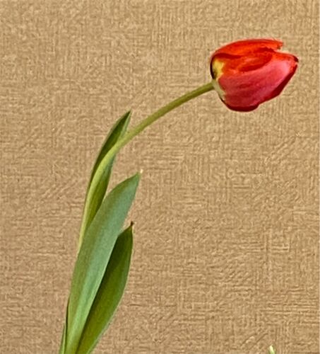 1本だけだけど、チューリップの花が咲きました!! でも、頭を垂れるこの姿、あのキャラクターに似ていませんか?